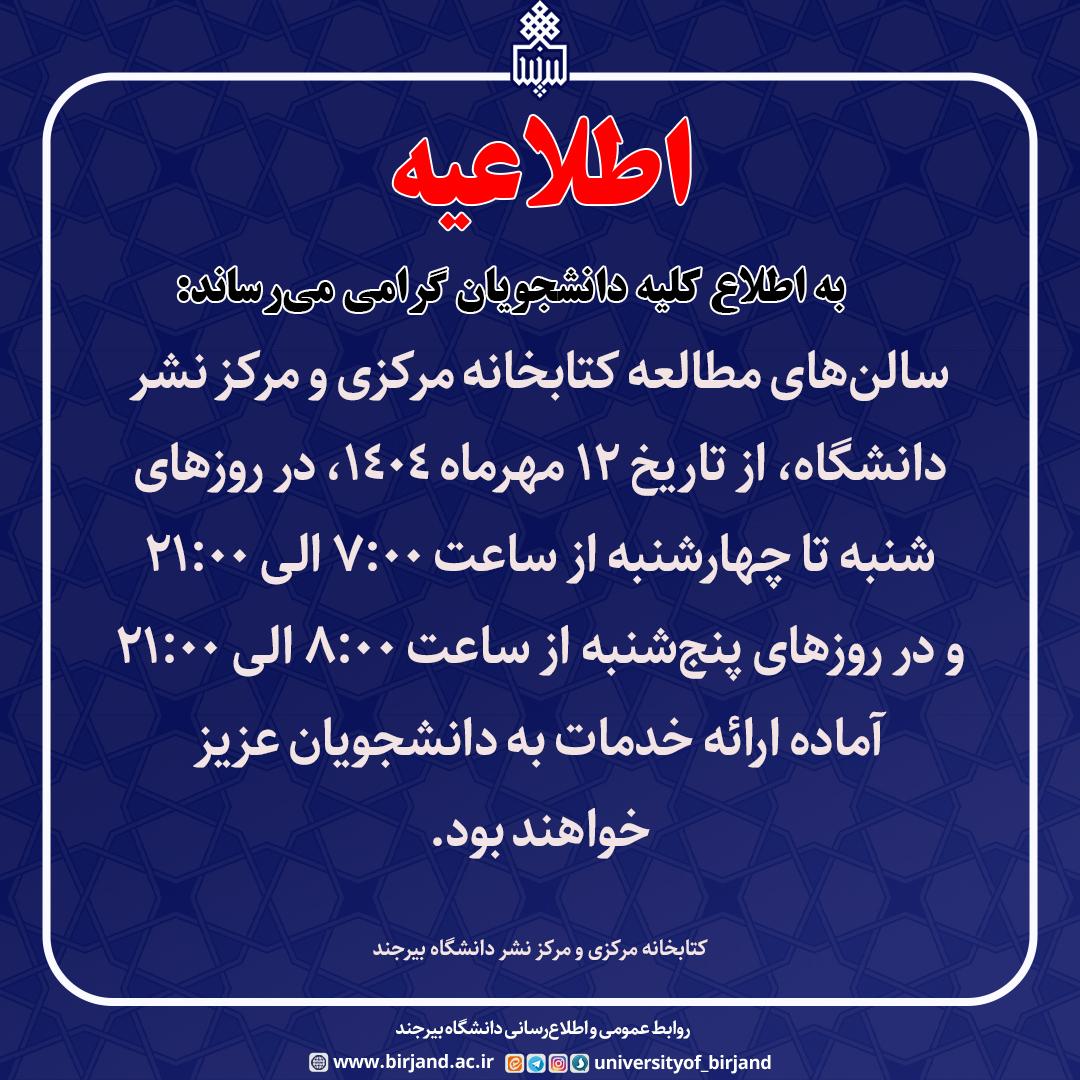 سالن‌های مطالعه کتابخانه مرکزی و مرکز نشر دانشگاه، از تاریخ 12 مهرماه 1404، در روزهای شنبه تا چهارشنبه از ساعت 7:00 الی 21:00