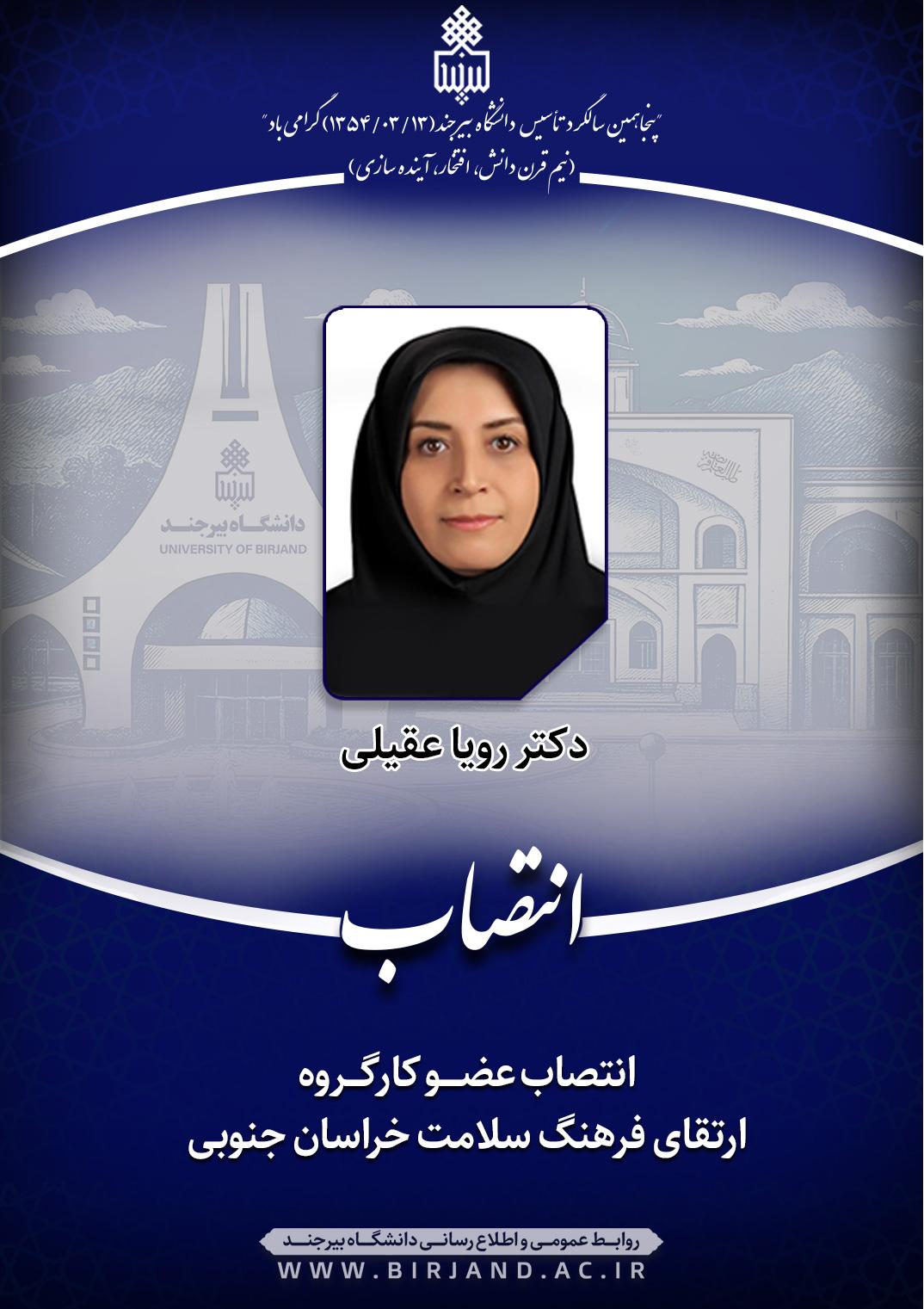 دکتر محمود گنجی‌فرد، رئیس دانشگاه علوم پزشکی و خدمات بهداشتی و درمانی با صدور ابلاغی، دکتر رؤیا عقیلی، رئیس اداره بهداشت و درمان دانشگاه را به عنوان عضو کارگروه ارتقای فرهنگ سلامت استان خراسان جنوبی منصوب کرد.