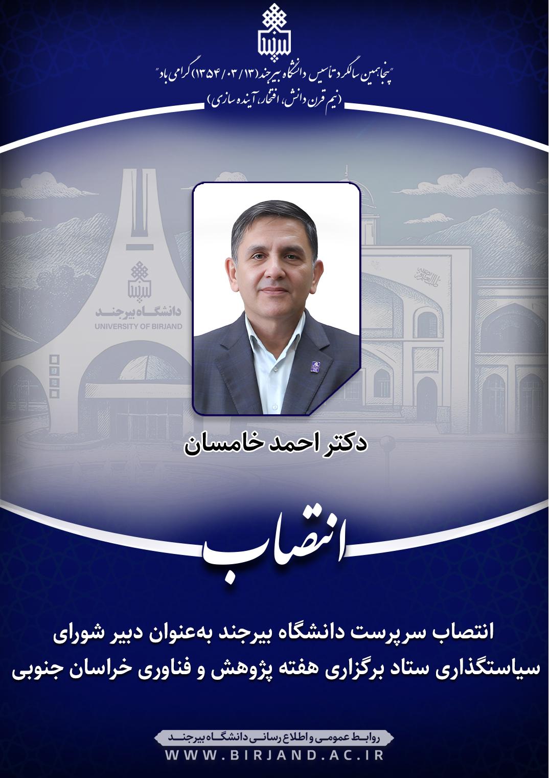 به گزارش روابط عمومی و اطلاعرسانی دانشگاه بیرجند، طی ابلاغی از سوی استاندار خراسان جنوبی و در اجرای ماده (۳) دستورالعمل ستاد استانی هفته پژوهش و فناوری و بر اساس نامه معاون پژوهشی وزارت علوم، تحقیقات و فناوری و رئیس ستاد ملی هفته پژوهش و فناوری کشور، دکتر خامسان، سرپرست دانشگاه بیرجند، بهعنوان دبیر شورای سیاستگذاری ستاد هفته پژوهش و فناوری استان خراسان جنوبی منصوب شد.