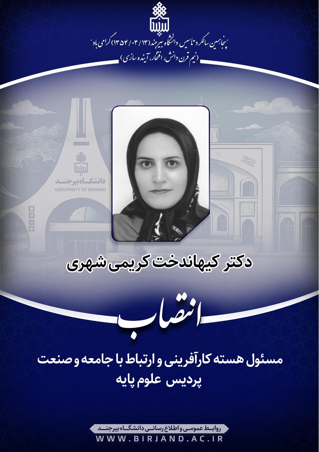 به گزارش روابط عمومی و اطلاعرسانی دانشگاه بیرجند، در این ابلاغ انتصاب آمده است؛ نظر به تعهد، تخصص و شایستگیهای علمی و اجرایی سرکارعالی و با عنایت به ضرورت توسعه فعالیتهای کارآفرینی و تعمیق ارتباط دانشـکدهها/پردیسهای دانشگاه با جامعه و صـنعت، بهموجب این ابلاغ با حفظ سمت آموزشی و پژوهشی، بهعنوان "مسئول هسته کارآفرینی و ارتباط با جامعه و صنعت پردیس علوم پایه" به مدت دوسال منصوب میشوید.